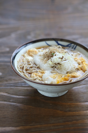 pecotyanさんへ たまごととろろですよー。 ちりめん山椒と黒七味をトッピングしております。 わたくし、そばは年中食べております☆