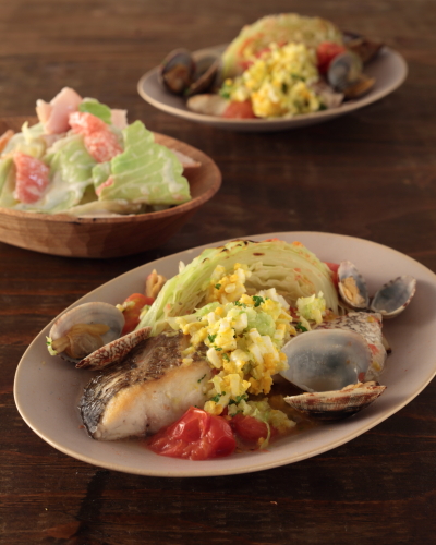 「焼きキャベツと鯛の蒸し煮 ミモザソース」を